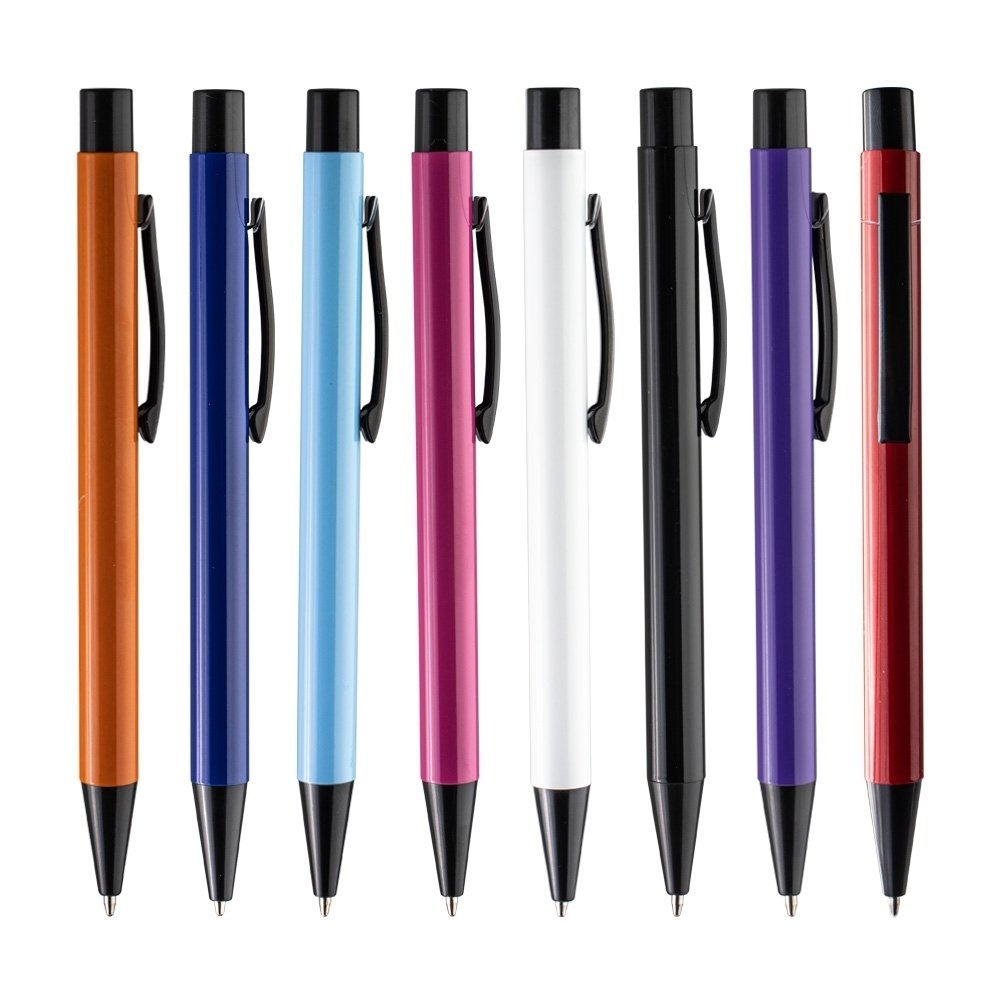 Caneta esferográfica, elegante e prática, com design moderno, acionamento por clique e acabamento vibrante em diversas cores.