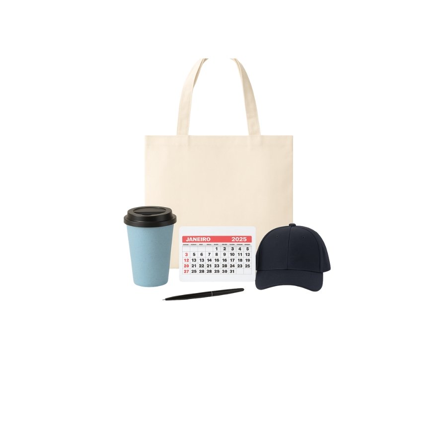 Ele transmite praticidade, cuidado e reforça a lembrança da sua marca no dia a dia dos clientes. O kit inclui: uma folhinha calendário 2026, ideal para presença diária da marca; uma caneta personalizada, prática e versátil para o cotidiano; um boné poliéster aba curva com tela, estiloso e confortável; um copo fibra de arroz com tampa 450ml, sustentável e prático para bebidas quentes ou frias; e uma sacola ecológica, resistente e reutilizável, que reforça valores de sustentabilidade.